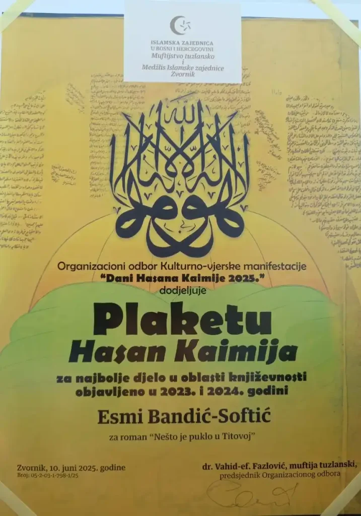 Našoj sugrađanki i višestruko nagrađivanoj spisateljici, Esmi Bandić-Softić, Organizacioni odbor kulturno-vjerske manifestacije „Dani Hasana Kaimije 2025“ dodijelio je danas u Zvorniku „Plaketu Hasan Kaimija“ za najbolje djelo u oblasti književnosti objavljeno u 2023. i 2024. godini za roman „Nešto je puklo u Titovoj“.