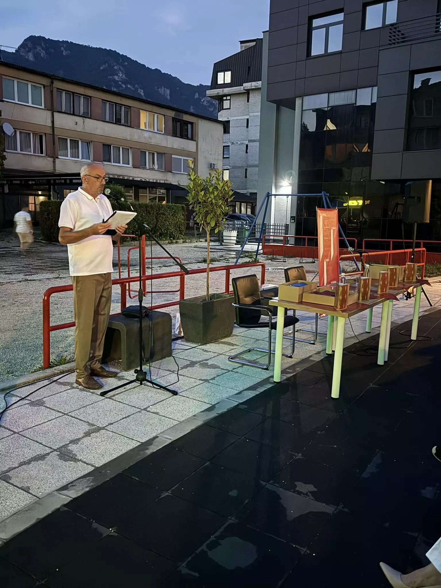 Kako je istakao direktor Javne ustanove Gradska biblioteka Travnik, doc. dr. Dženan Kos, „Promocija romana ‘Zbjeg’ bila je prva promocija i ujedno prvi književno-kulturni događaj na Trgu književnosti za koji je idejni projekat urađen sredinom 2019. godine kada je planirano da trg bude posvećen Ilhamiji, Andriću, Kulenoviću i Džumhuru, te da kao jedinstvena arhitektonska cjelina promovira i prezentira velikane pisane riječi koji su svojim književnim djelima ili dijelovima svojih biografija vezani za Travnik. U međuvremenu je Općina Travnik Gradskoj biblioteci ustupila na korištenje za postavku književne scene dio Trga književnosti čime je od prvobitne ideje da promovira i prezentira zaslužne književnike, Trg književnosti sada postao jedinstven prostor na kome će se promovirati i prezentirati aktuelna izdanja knjiga i djela iz bosanskohercegovačke i svjetske književnosti, nauke, obrazovanja i slično.“