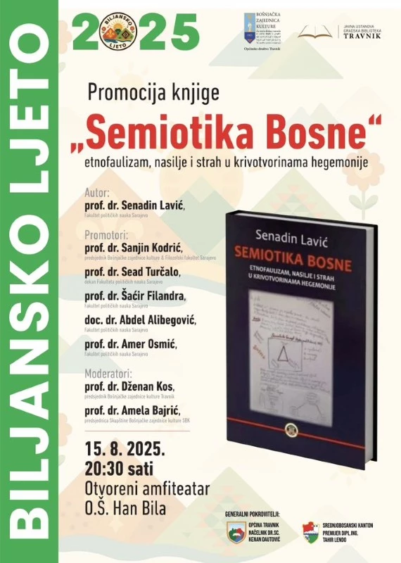U okviru manifestacije „Biljansko ljeto 2025“, u amfiteatru Osnovne škole „Han Bila“ u Travniku, 15. avgusta održana je promocija knjige „Semiotika Bosne – etnofaulizam, nasilje i strah u krivotvorinama hegemonije“ autora prof. dr. Senadina Lavića, redovnog profesora Fakulteta političkih nauka u Sarajevu. Organizatori događaja bili su Gradska biblioteka Travnik i Bošnjačka zajednica kulture Travnik.